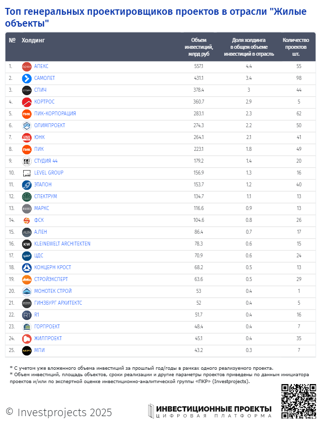 Рис. 2. Топ-25 генеральных проектировщиков проектов в отрасли «Жилые объекты».