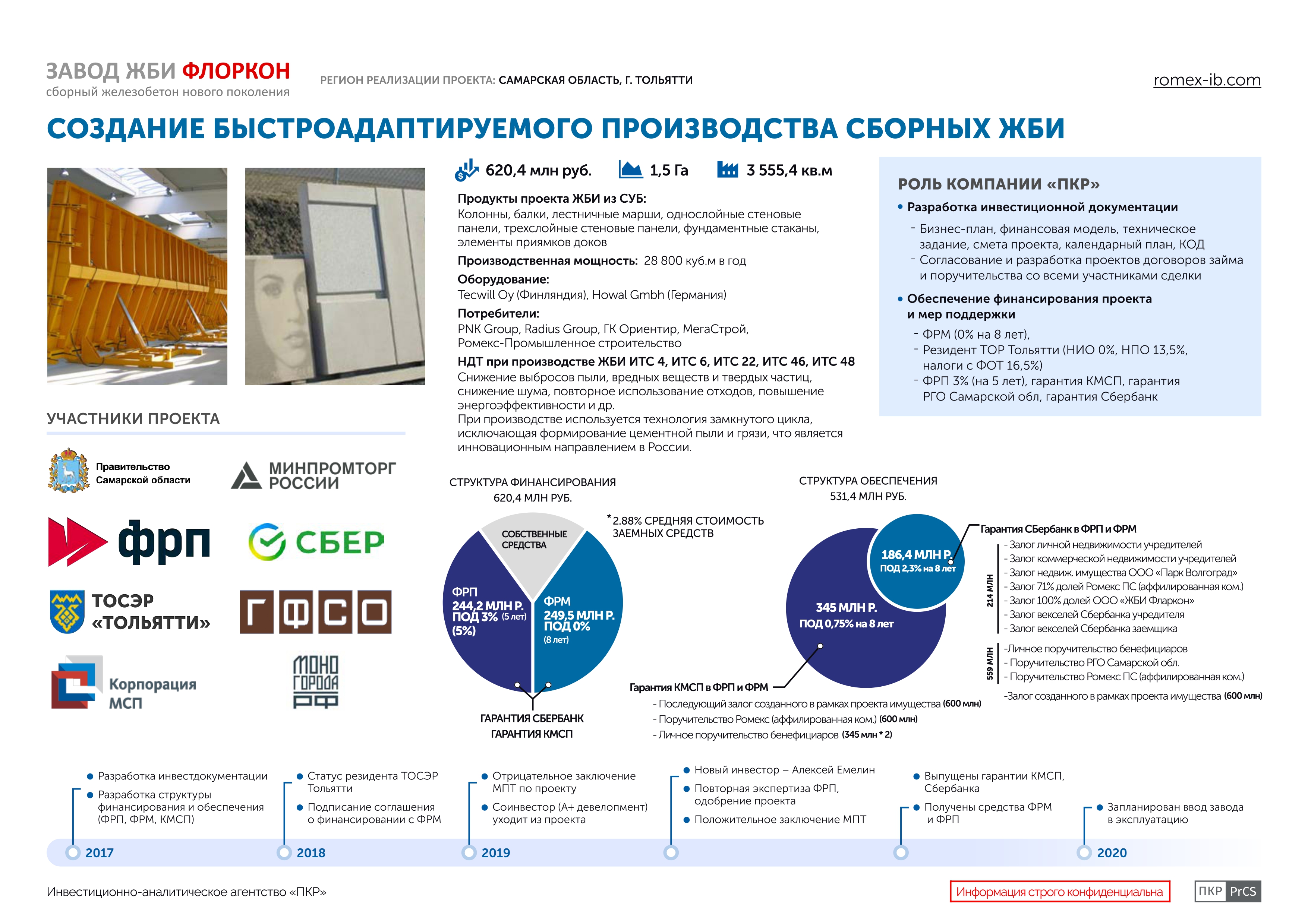 Компания «ПКР» выступила разработчиком инвестиционного проекта «Создание быстроадаптируемого высокотехнологичного производства железобетонных изделий» и обеспечило для предприятия привлечение льготного финансирования институтов поддержки: Фонда развития моногородов, Фонда развития промышленности, Корпорации развития малого и среднего бизнеса.