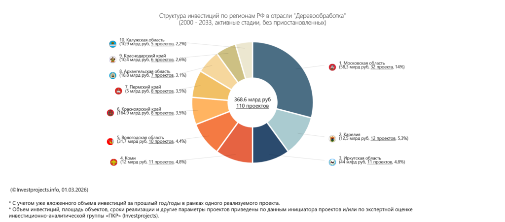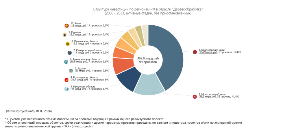 В ТОП-5 регионов РФ по количеству проектов деревообработки входят Республики Карелия и Коми, а также Вологодская и Иркутская области, которые традиционно являются лидерами по лесозаготовке в связи с близостью сырьевой базы. По объёму инвестиций в отрасль первое место занимает Красноярский край — это обусловлено проектом строительства ЦБК в рамках создания крупного биотехнологического комплекса по глубокой переработке древесины, о котором упоминалось ранее.