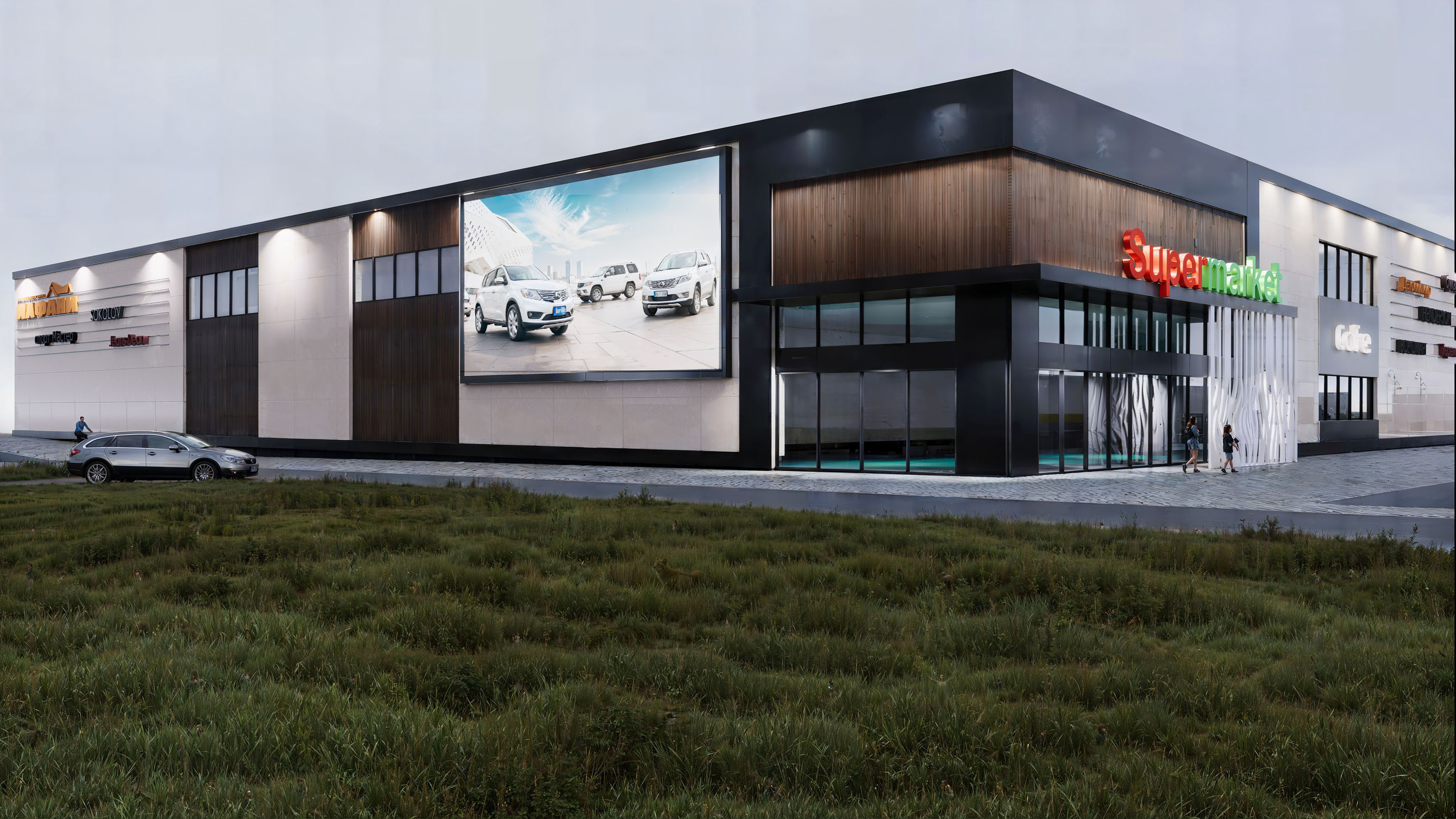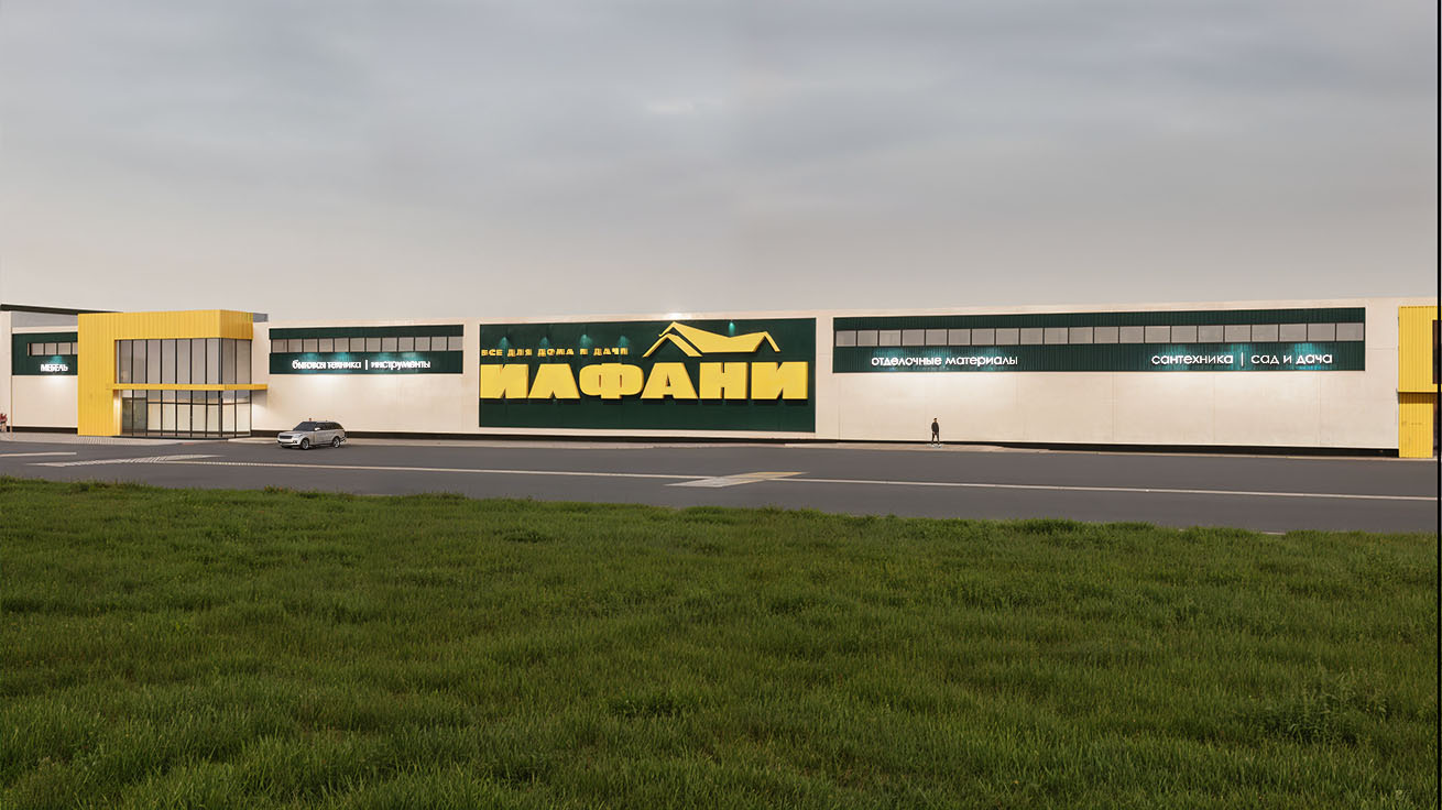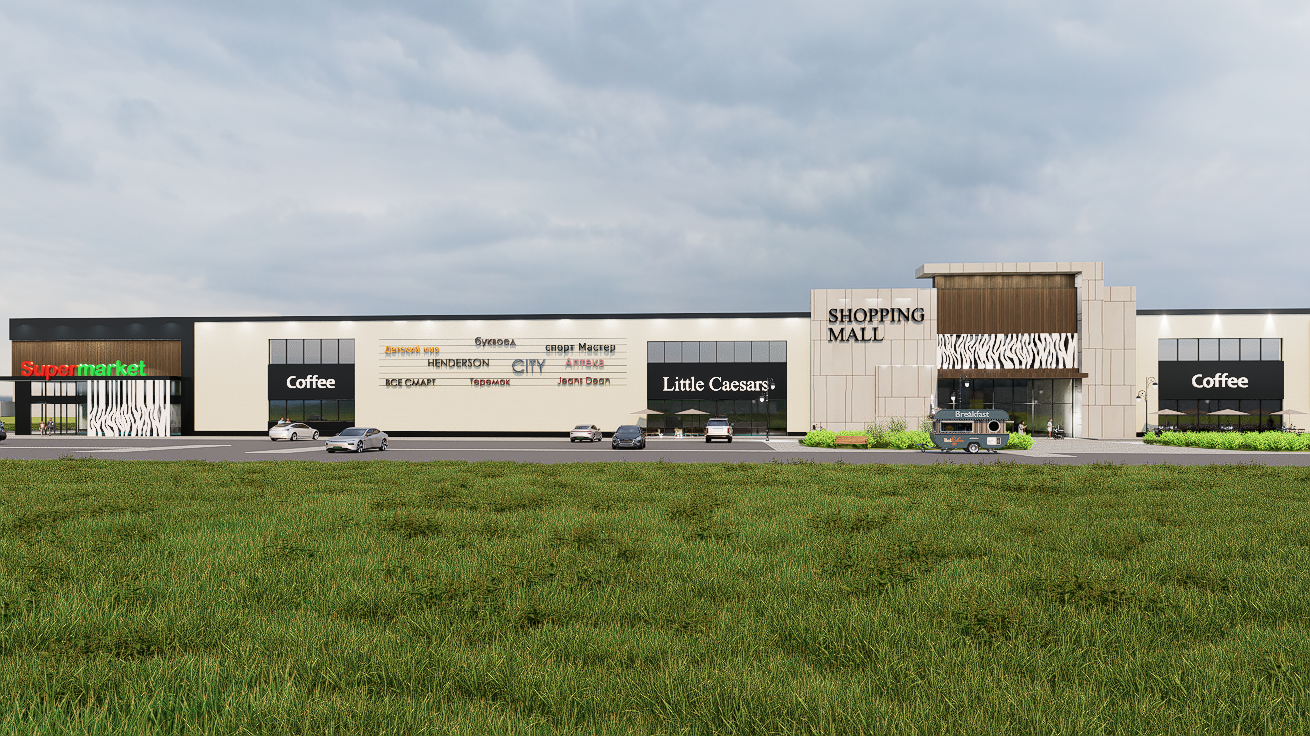 В ходе работы были подготовлены ситуационные и поэтажные планы, проработаны фасадные решения, а также выполнены визуализации и фотомонтажи для наглядной интеграции объекта в существующий ландшафт. Концепция обеспечивает широкий спектр услуг — от повседневных покупок и строительных товаров до семейного отдыха, развлечений и занятий спортом.